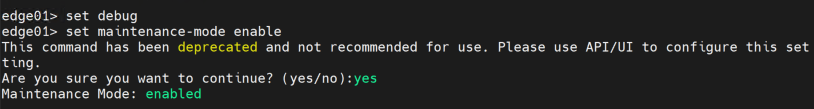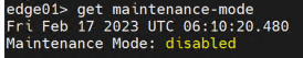 SSH로 Edge에 접속 합니다. get maintenance-mode 명령어를 통해 현재 maintenance mode status를 확인합니다.