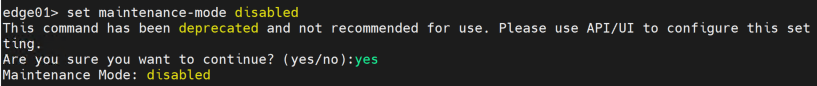 m/m mode exit를 위해 'set maintenance-mode disalbed' 명령을 입력하면 m/m mode 해제가 진행됩니다.