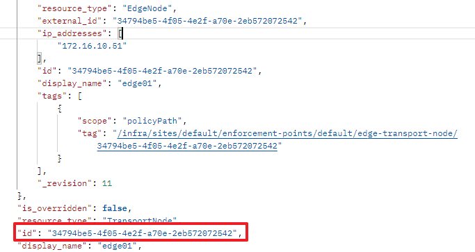API에서 'GET https://nsxmgr/api/v1/transport-nodes' 입력 후 Edge의 transport-node id를 확인합니다.